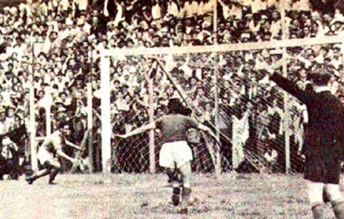 1940 Estadio San Mamés, Bilbao. Por la 4ª jornada de Liga 1940/41. El Athletic-Aviación (hoy Atlético de Madrid) derrotó al Atlético de Bilbao (hoy Athletic Club) 5 a 0. Goles: Prudencio “Pruden” Sánchez -4- y Juan Vázquez Tenreiro. Los madrileños serían bicampeones de Liga (1939/40 y 1940/41); fueron los primeros disputados luego de la Guerra Civil.